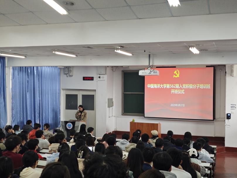 3月17日下午,中国海洋大学第562期入党积极分子培训班开班仪式在鱼山校区新教学楼0201教室举行。九游老哥J9俱乐部官网党委专职组织员王晓菲出席开班仪式。仪式由九游老哥J9俱乐部官网辅导员周晓华主持,共有来自医药学院、水产学院、海洋生命学院和基础教学中心的169名入党积极分子参加。