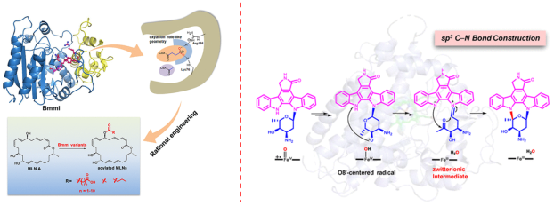 海洋天然产物是创新药物研发的重要源泉,解析其生物合成途径并阐明关键元件的催化机制,对通过合成生物学实现化合物的理性设计和结构优化具有重要意义。近年来围绕海洋微生物活性天然产物的挖掘和生物合成机制研究,我们取得了以下几方面的研究成果: 1、海洋药源分子生物合成途径解析和重构 Streptocarbazoles类化合物具有独特的C1′?N13和C3′?N12糖苷键,通过生物合成途径的理性改造和异源重构,获得了抗肿瘤活性良好的衍生物,进一步采用基因阻断和异源表达探究了其生物合成机制;通过异源表达激活了二酮哌嗪类化合物lansais,进一步通过体内基因阻断和体外生化实验,阐明了该类化合物的生物合成途径。以上结果为开展药源分子的理性设计和结构改造提供了重要基础。 2、海洋药源分子生物合成途径关键功能元件的酶学机制解析 酰基基团是许多活性天然产物的药效基团,通过体内遗传学、体外酶学和蛋白晶体学解析了Macrolactins酰基化后修饰的分子机制;Staurosporine是蛋白激酶C的有效抑制剂,首次通过体内遗传学和体外酶学阐明了由细胞色素P450酶催化的N12?C5′糖苷键组装步骤,并采用蛋白晶体学和QM/MM计算揭示了其新颖的分子催化机制。以上结果为药源分子的高效合成和结构改造提供了有力功能元件。