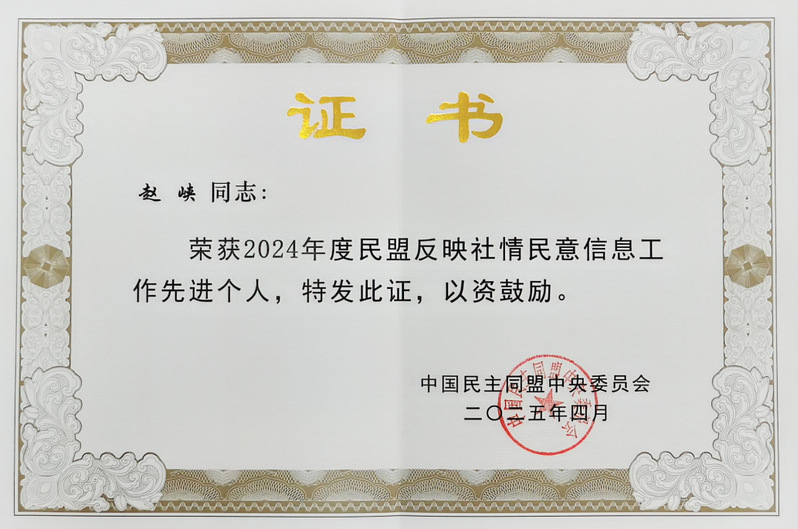 近期,民盟中央2025年参政议政工作会议在北京召开。会议通报表彰了2024年度参政议政工作及反映社情民意信息工作先进单位与先进个人。中国海洋大学九游老哥J9俱乐部官网赵峡教授荣获民盟中央授予的“民盟反映社情民意信息工作先进个人”称号。长期以来, 赵峡教授聚焦海洋生物医药产业发展和人民群众普遍关心的热点、难点问题,积极参与议政建言工作,组织开展调查研究,为助推地方经济社会高质量发展作出了积极贡献。