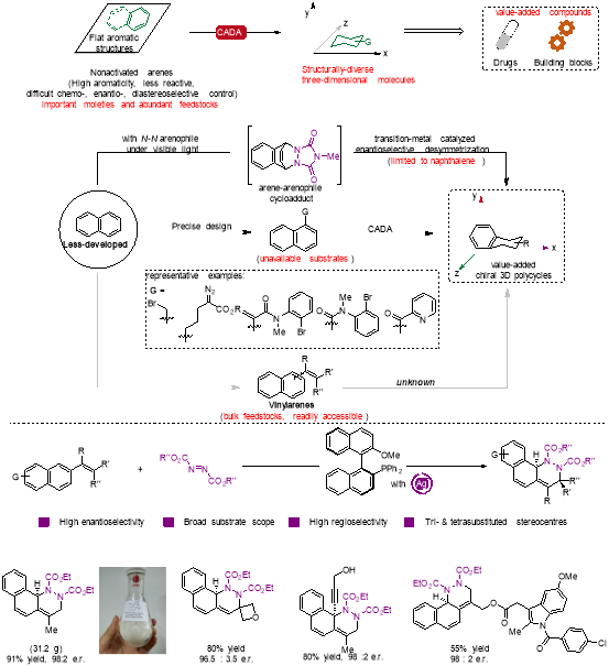 高对映体富集的脂肪族多环骨架结构是众多药物和生物活性天然产物的核心结构单元。这类三维骨架显著增加了分子复杂性,并深刻影响其理化性质、生物活性及毒性特征。然而其合成也面临诸多挑战,如冗长的多步合成路线和对预官能团化底物的需求。在此背景下,稠合芳烃的催化不对称去芳构化反应(CADA)为直接构建高对映体富集、结构多样化的三维骨架提供了一种独特而高效的策略。该策略不仅可用于生成高附加值砌块,还可促进药物候选分子的后期官能团化。过去十几年间,该领域的研究主要集中在具有电子偏向性的芳香化合物(如苯酚、萘酚、萘胺以及吲哚)上,然而萘类化合物因其显著的芳香性,在CADA反应中的应用仍面临巨大挑战。