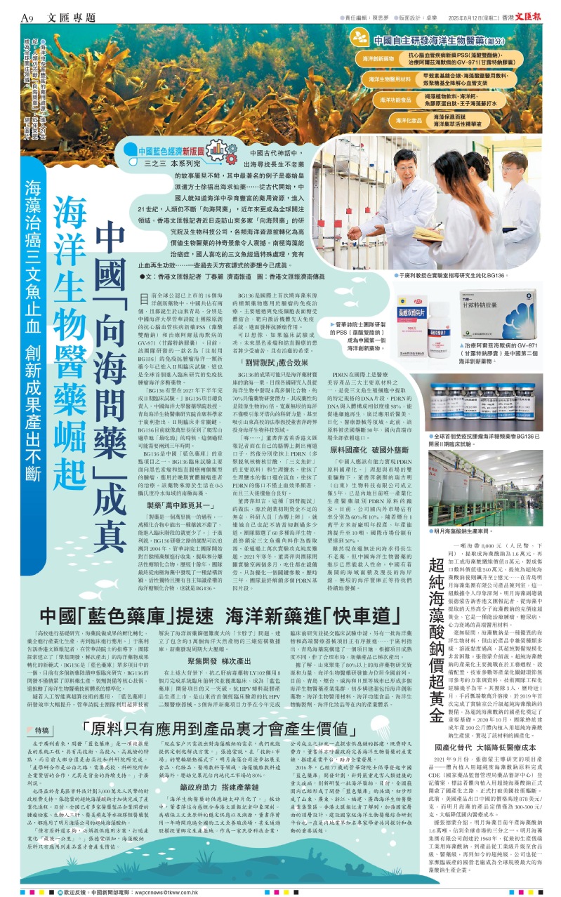 8月12日,香港文汇报以《中国“向海问药”成真 海洋生物医药崛起》为题,整版报道了国内海洋生物医药领域的前沿进展,并对中国海洋大学于广利教授主导研发的海洋免疫抗肿瘤候选药物BG136进行了重点推介。