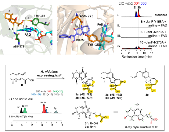 研究团队首先从一株海洋淡紫青霉Penicillium janthinellum H7-4中发掘出一个沉默的倍半萜类生物合成基因簇(jan cluster),并通过在野生菌株中过量表达该基因簇中的途径特异性转录因子JanG,成功激活了该基因簇,获得了具有芳香结构的eremophilanes类倍半萜衍生物farfugin A。为进一步解析其生物合成潜力,研究团队将janA-F功能基因在模式菌株Aspergillus nidulans A1145中逐步异源表达,成功获得了包括farfugin A和一类新颖的由eremophilane骨架与L-苏氨酸杂合而成的芳香倍半萜-氨基酸加合物aza-janthinellin A。后续生物合成机制研究进一步揭示,在farfugin A与aza-janthinellin A的合成过程中均存在由(氧或氮原子)亲核加成引发、并伴随[1,2]-烷基迁移的环重排机制,最终完成芳香化的过程。尤其在aza-janthinellin A形成过程中,一个FAD依赖型单加氧酶JanF被证实能够催化氧化烯丙醇从而生成,具有高反应活性的α,β-不饱和醛中间体,进而接受伯胺类试剂的亲核攻击,以此引发骨架的烷基化迁移和芳香化重排。研究还发现JanF可通过其活性口袋中的Asn273残基稳定C8-羰基,选择性地引导α,β-不饱和酮发生1,2-加成而非1,4-加成,这一过程是构建芳香骨架的关键步骤(图2)。在此基础上利用JanF强大的催化功能,多种伯胺试剂与具有α,β-不饱和醇的eremophilane底物进行孵育,可以获得结构多样、活性良好的一系列氨基酸-eremophilane加合产物。
