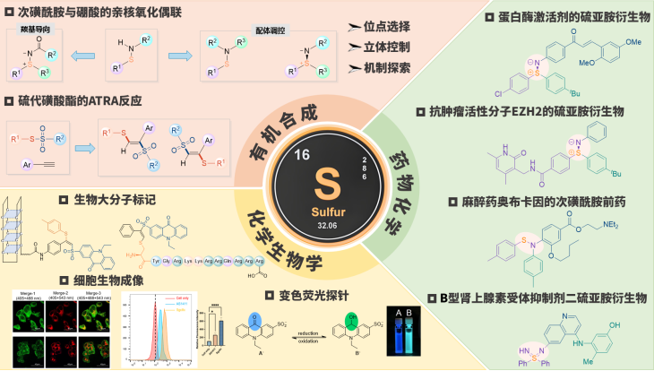 本课题组的研究方向主要分为硫化学以及DNA化学生物学两个方面。在硫化学方面,本课题组基于Chan-Lam偶联在硫亚胺和亚砜亚胺等新颖药效团构建与应用方面做出了系统性的工作,提出由次磺酰胺合成硫亚胺的新思路,发展了外加配体调控Chan-Lam偶联化学选择性与对映选择性的新策略,建立了无外加氧化剂下Chan-Lam偶联的新范式,并将其开发成为多肽药物后期修饰以及蛋白标记的新颖工具;也发展了可以响应细胞内氧化活性物质水平的含硫变色荧光探针ESAC,将其成功标记到穿膜肽、核酸适配体等功能生物大分子中,实现了细胞内成像研究。在化学生物学方面,以DNA识别为中心,我们设计并合成了一系列吡咯-咪唑多肽分子(PIP),通过分子间氢键高亲和力和特异性结合错配的碱基对,开发用于治疗癌症的肽类抗癌药物,并利用PET等技术研究其代谢、分布等重要药学问题。 | |||||