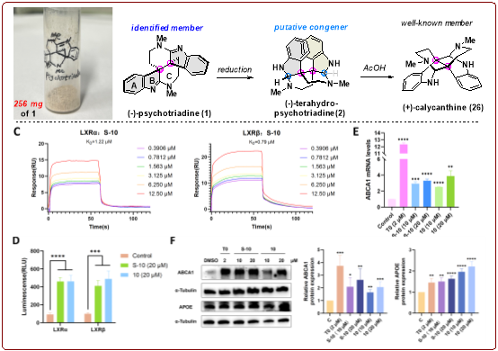 研究团队从简单原料色胺出发,仅需12步即可高效完成256毫克天然产物(?)-Psychotriadine的对映选择性全合成,通过X射线晶体学分析确定其绝对构型,为解析天然Psychotriadine的构型提供了关键依据。此外,研究团队进一步通过立体选择性还原合成了生物同源物Tetrahydropsychotriadine,证实了同系物的可及性和生源假说。由于物质本身难以获取,导致Psychotriadine及其同系物的生物活性研究从未被涉足,研究发现合成中间体S-10与10能够作为高效的肝X受体(LXRs)激动剂,显著上调ABCA1和APOE的蛋白表达水平,展现出作为治疗阿尔茨海默症药物先导化合物的良好潜力。
