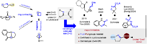多取代氮杂环丁烷作为一类重要的分子片段,在上市药物和化学催化中起到重要作用。目前合成氮杂环丁烷最主要的方法是通过温和的可见光催化aza Paterno-Buchi反应来构建,主要包括:(1)2019年Schindler课题组最先报道以肟为底物通过可见光照射实现分子内aza Paterno-Buchi反应,后续又陆续开发了环肟、分子间开链等不同构建氮杂环丁烷的方法;(2)2020年游书力课题组通过激发被修饰的吲哚和肟也实现分子内aza Paterno-Buchi反应;(3)2020年Bach课题组通过自己组开发的不对称催化剂实现了手性氮杂环丁烷的构建;(4)2023年Brown课题组以氧化苯并异噻唑为底物实现分子间aza Paterno-Buchi反应。但大多C=N底物都需要推拉电子基团的存在和面临立体选择较差的问题,尤其后者极大限制了aza Paterno-Buchi反应的总体效益,因此拓展C=N底物的种类和改善反应的立体选择具有重要意义。
