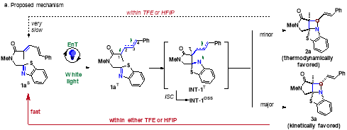 在有了上述研究后,我们提出了一条可行的质子介导的差速催化机理:首先底物在白光条件下与钌光敏剂发生能量转移,被激发的diene部分与氮杂芳烃发生[2+2]环加成生成氮杂四元环,此时生成的动力学产物构型因为体系中TFE的存在,N原子与TFE的氢键结合削弱了CN键进而促进了逆aza-[2+2]环加成过程,从而实现了对热力学产物构型的富集,达到dr值改善的目的。