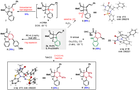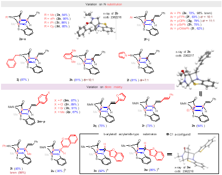 在实现了多取代氮杂环丁烷的构建并成功提高反应的dr值拿到单一热力学产物后,我们又对其后续的转化进行了研究。实验结果显示除了氮杂四元环系外,反应可以进一步拓展到氮氧五元环、氮杂六元环、氮氧六元环、氮氮六元环等,并且部分产物也都进行了单晶验证,表明多取代氮杂环丁烷可以进一步扩环成不同的环系,丰富了氮杂环系的合成来源。