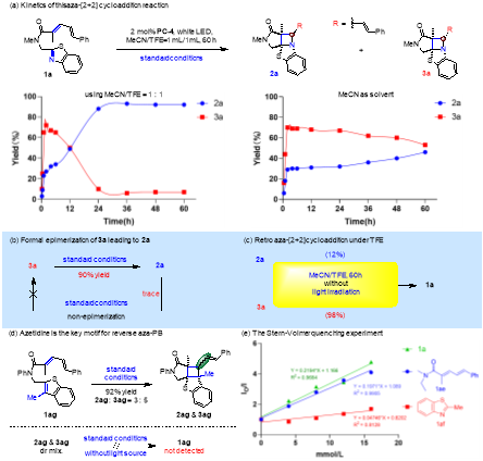 为了探究反应的机理过程,我先做了stern-volmer荧光淬灭实验,实验证明底物中被激发的位置为diene部分而非氮杂芳烃,这也与我们的gaussian计算结果相对应。在确定了成环机理后我们又对最重要的dr值改善机理进行研究,首先通过动力学监测发现在标准条件下并不是通过抑制其中一个构型的生成来实现的dr值提高,而是通过促进其中一个构型的消耗来实现的。后又通过两个构型之间的转化实验,底物与产物之间的转化实验证明dr值提高的过程是四元环打开的逆aza-[2+2]环加成过程而不是仅CN键的断裂与重建过程。最后研究表明当把氮杂四元环换成全碳四元环时则不会发生dr值的提高,说明N原子与质子的结合是逆aza-[2+2]环加成的关键原因。