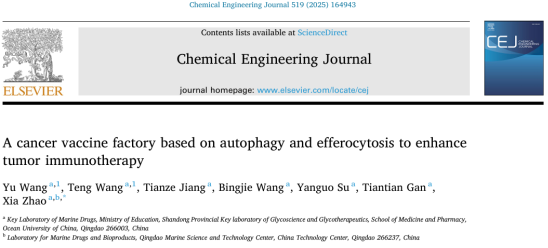 近期,中国海洋大学九游老哥J9俱乐部官网赵峡教授团队基于自噬和胞葬抑制构建了一种共递送水凝胶(CCFA@Gel),通过设计程序化“暴露-保留-呈递”的“癌症疫苗工厂”策略,显著抑制了原发性肿瘤和肿瘤的转移,在肿瘤疫苗和免疫治疗方面取得了新进展。相关研究成果以“A cancer vaccine factory based on autophagy and efferocytosis to enhance tumor immunotherapy(基于自噬和胞葬增强肿瘤免疫治疗的癌症疫苗工厂)”为题,发表于《Chemical Engineering Journal》(IF=13.2,TOP期刊)。
