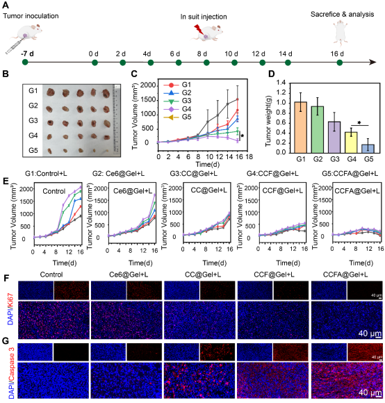 图2:CCFA@Gel+L的体内抗肿瘤作用。(A)小鼠体内治疗示意图。(B)治疗结束时不同组小鼠肿瘤的照片。(C)不同治疗组小鼠的肿瘤体积变化。(D)不同治疗组小鼠的最终肿瘤重量。(E)不同治疗组的个体肿瘤生长曲线。(F)治疗结束时肿瘤切片的Ki67表达(红色荧光)。(G)治疗结束时凋亡蛋白Caspase 3在肿瘤组织中的表达。