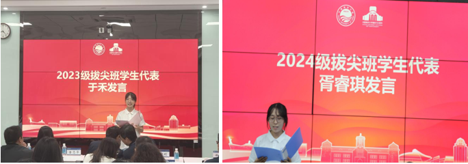 2023级拔尖班学生代表于禾同学回顾过去一年在华实班的成长历程,分享了赴韩国釜山大学研学的收获,以海洋药物研究为核心,将国际视野转化为创新动力。作为首届华实班成员,他们将以管华诗院士为榜样,弘扬“探索海洋,造福人类”精神,营造学术氛围,为后续班级树立标杆。